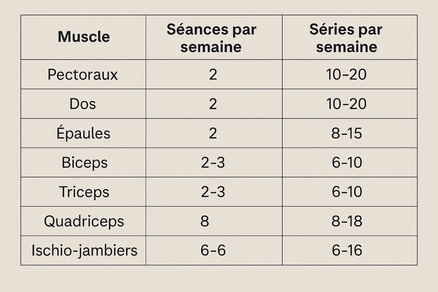 Voici un tableau des recommandations en fonction du groupe musculaire et du niveau d’entraînement :